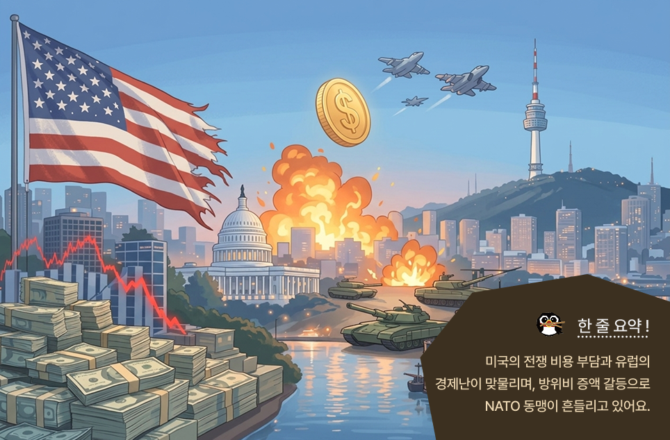 미국-이란 간 전쟁이 길어지면서 미국의 재정 부담이 커지고 있어요. 하루 전쟁 비용만 수십억 달러에 달하는 상황에서 재정 적자는 이미 위험 수위를 넘어섰고 고물가・고환율에 자국민들조차 트럼프 행정부를 부담스러워하기 시작했어요. 이런 상황에서 트럼프는 NATO 동맹국들에 GDP의 5%를 국방비로 부담하라고 압박하며 심지어 NATO 탈퇴 가능성까지 흘리고 있어요. 미국으로선 전쟁 비용으로 구멍 난 재정을 동맹국과 함께 채워야 한다는 논리지만, 유럽도 러시아-우크라이나 전쟁 장기화로 에너지 비용이 급등하고 재정 여력이 빠듯한 상황이라 선뜻 받아들이기 어려워요. 결국 양측 모두 재정 어려움이 있는 상황에서 서로에게 부담을 떠넘기는 구도가 되어버린 거예요. 80년간 이어온 NATO 동맹 구조가 경제적 균열을 계기로 흔들리고 있어요.