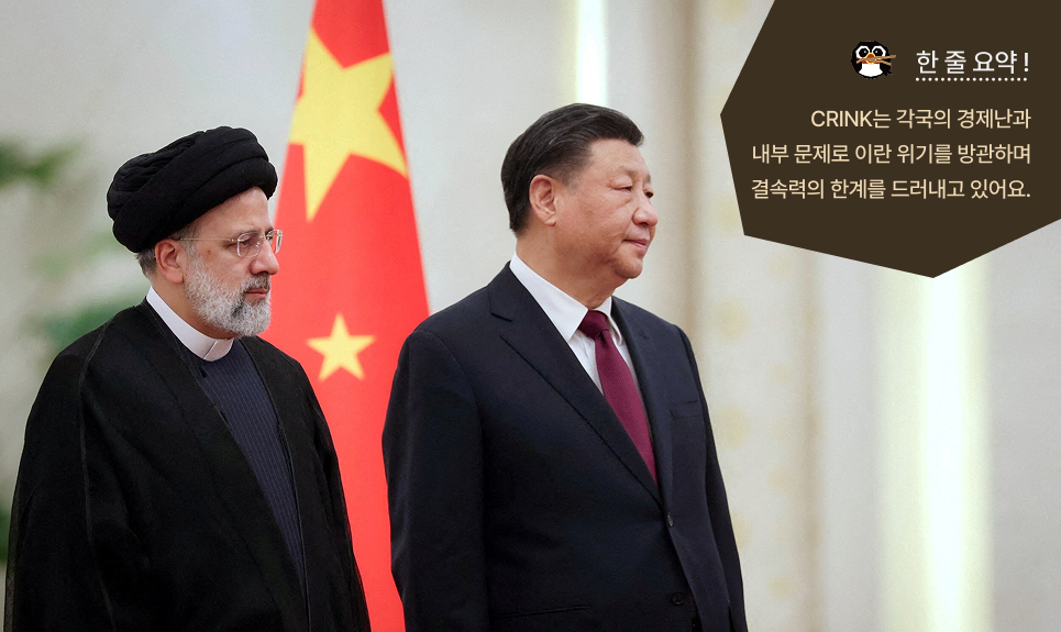 CRINK는 중국(C), 러시아(R), 이란(I), 북한(NK) 4개국의 머리글자를 따, 반미·반서방 성향의 권위주의 국가를 묶어 부르는 용어예요. 언뜻 보면 강력한 반미 연합 같지만, 사실 이들은 '공통의 적' 때문에 잠시 손을 잡았을 뿐이에요. 미국-이란 간 전쟁 장기화로 중동 전역에 전례 없는 긴장감이 감돌면서 CRINK의 근본적 한계가 드러나고 있죠. 이란이 위기에 놓였지만 우방을 자처하던 나머지 국가들은 방관하고 있어요. 중국과 미국은 서로 깊이 연결된 경제 관계지만 동시에 가장 치열한 패권 경쟁 상대예요. 미국은 반도체 규제와 관세로 중국을 견제하는 반면, 중국은 기술적으로 자립하고 공급망을 재편해 대응하고 있죠. 또 러시아는 이미 우크라이나와의 전쟁이 예상보다 훨씬 장기화되면서 막대한 군사비와 병력을 소모하고 있어요. 따라서 이란을 도울 힘도, 미국을 상대로 새로운 전선을 만들 역량도 부족한 상황이에요. 이란과 무기 밀거래 정황이 있었던 북한은 더 절망적이에요. 만성 경제난과 내부 체제의 문제에 시달리는 북한은 이란에 실질적인 지원도 제공한 여력이 없는 상황이에요.