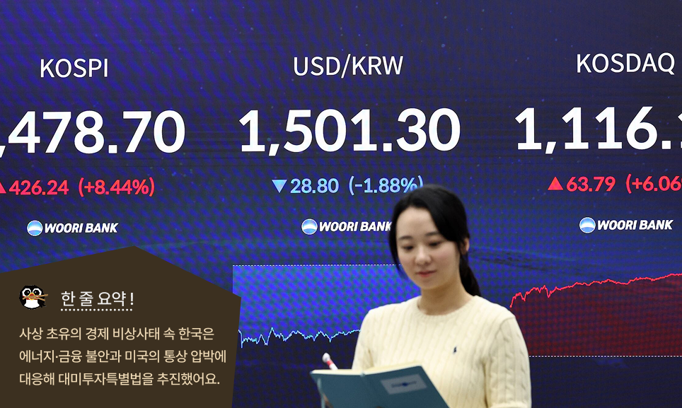 미국-이란 전쟁 여파는 한국 경제에도 큰 영향을 미치고 있어요. 호르무즈 해협 불안으로 국제 유가가 출렁이자 한국 주가는 급락했고 원・달러 환율은 1,500원을 넘어섰어요. 에너지 수급에도 빨간불이 켜지면서 약 1만 1000곳의 공공기관, 지방자치단체 등에서는 자동차 운행이 5부제에서 2부제로 강화됐어요. 여기에 미국의 관세 압박까지 더해지면서 정부는 결국 전쟁 추경 카드까지 꺼내 들었어요. 한국은 3,500억 달러 규모의 대미투자특별법을 통과시키며 협력 의지를 보였지만, 미국은 관세 압박을 유지하며 협력과 견제를 병행하고 있어요.